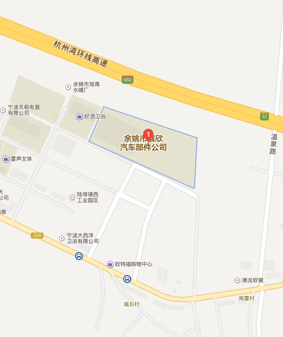 余姚市展欣汽車部件有限公司,地處寧(波)紹(興)平原中心,位于風(fēng)景秀麗的浙江省余姚市陸埠鎮(zhèn)西工業(yè)園區(qū)。緊靠杭甬高速和蕭甬鐵路,近臨杭州灣跨海大橋,距河姆渡遺址10公里,距寧波櫟社國際機(jī)場40公里,距杭州蕭山國際機(jī)場80公里,交通便捷。